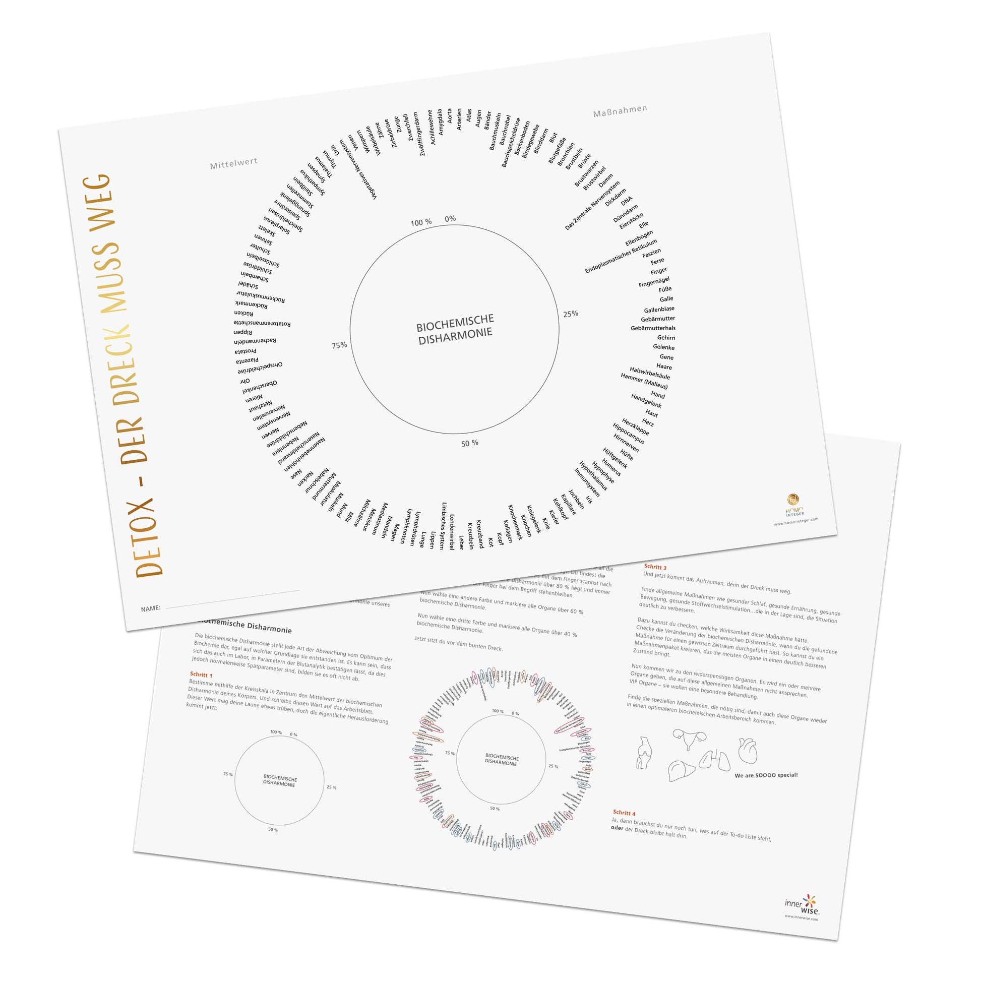 Bestimme mithilfe der Kreisskala im Zentrum den Mittelwert der biochemischen Disharmonie deines Körpers. Und schreibe diesen Wert auf das Arbeitsblatt. Dieser Wert mag deine Laune etwas trüben, doch die eigentliche Herausforderung kommt jetzt.