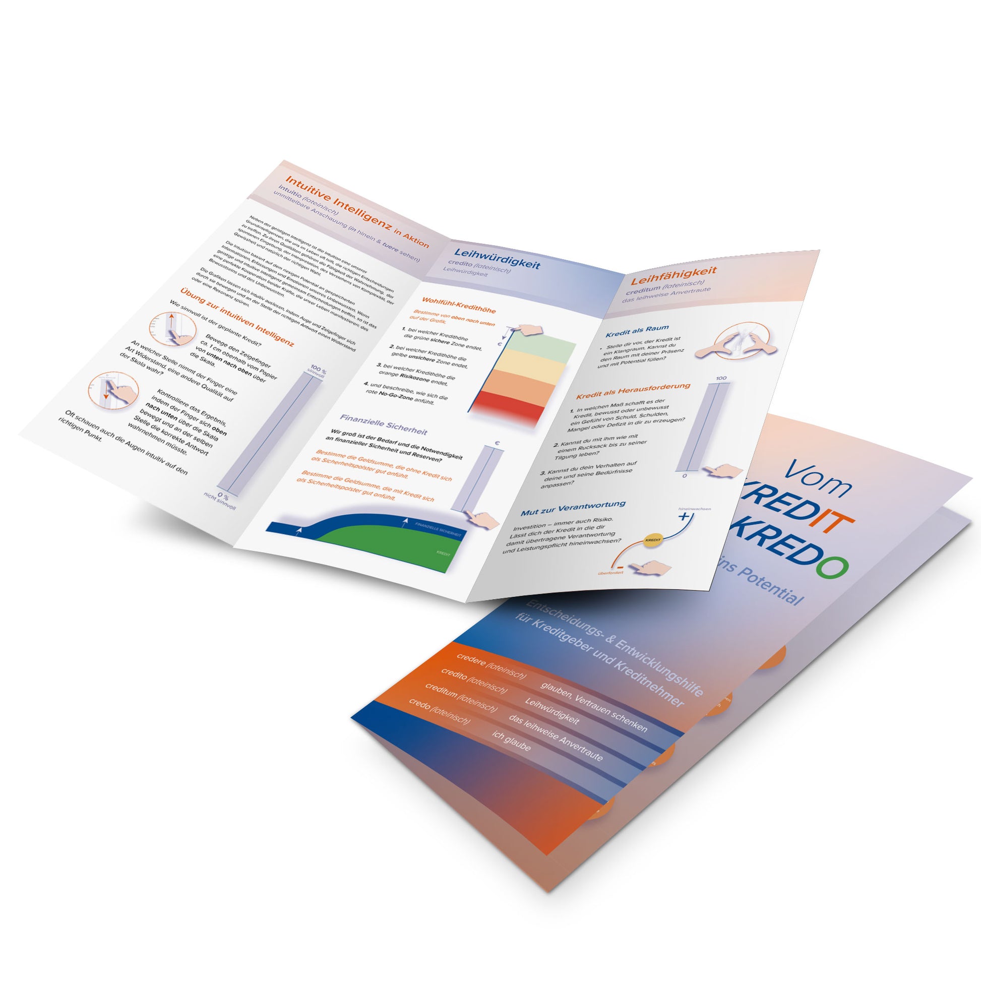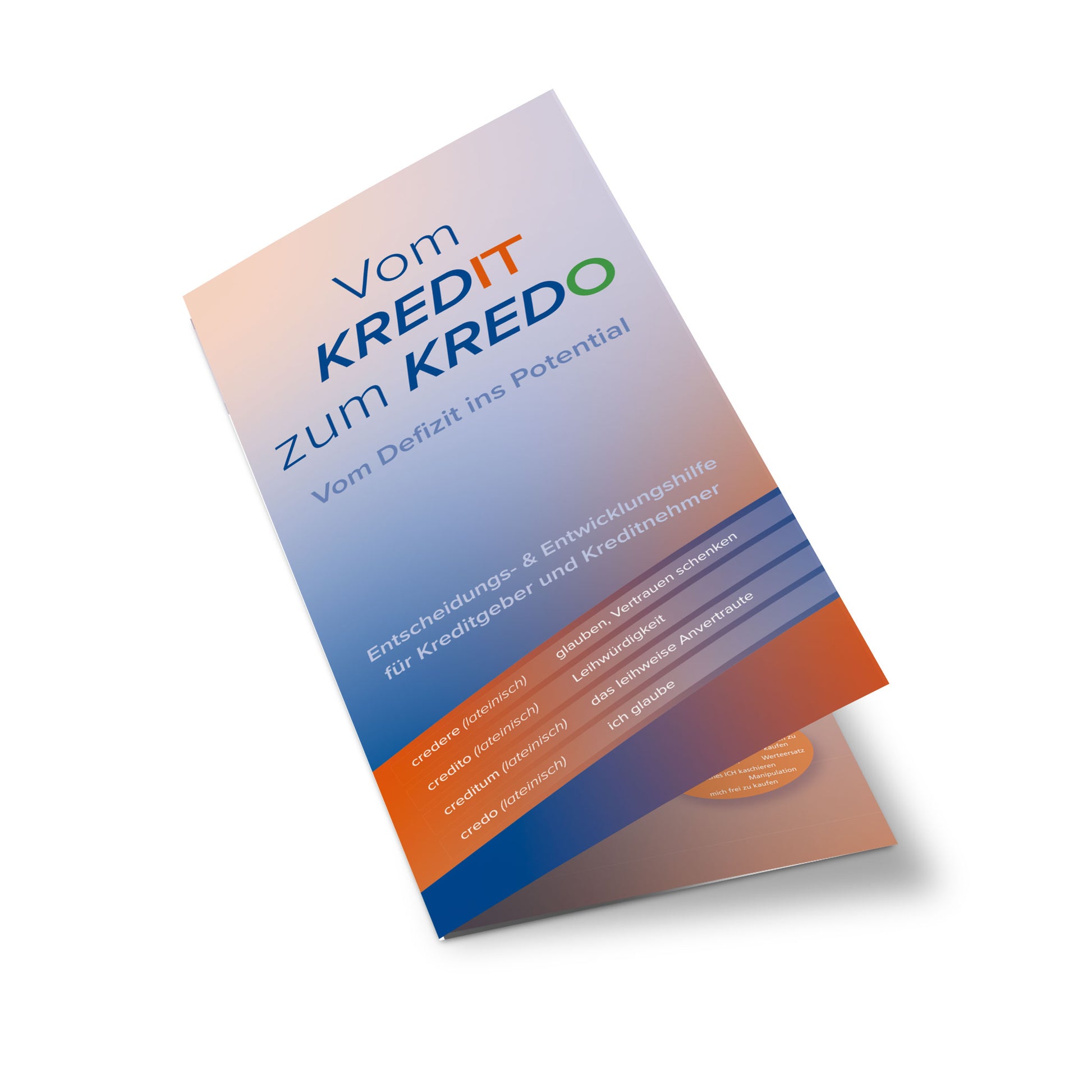 Wer Kredite aufgenommen hat, kennt ihr durchdringende unterschwellige Wirkung auf viele Lebensbereiche. Das Faltblatt hilft, die richtige Entscheidung zu treffen bei der Kreditaufnahme. Und es hilft die subtilen Negativeffekte des Kredites – einer Schuld auf eine Zukünftige Leistung – in Potential und Freiheit zu wandeln.